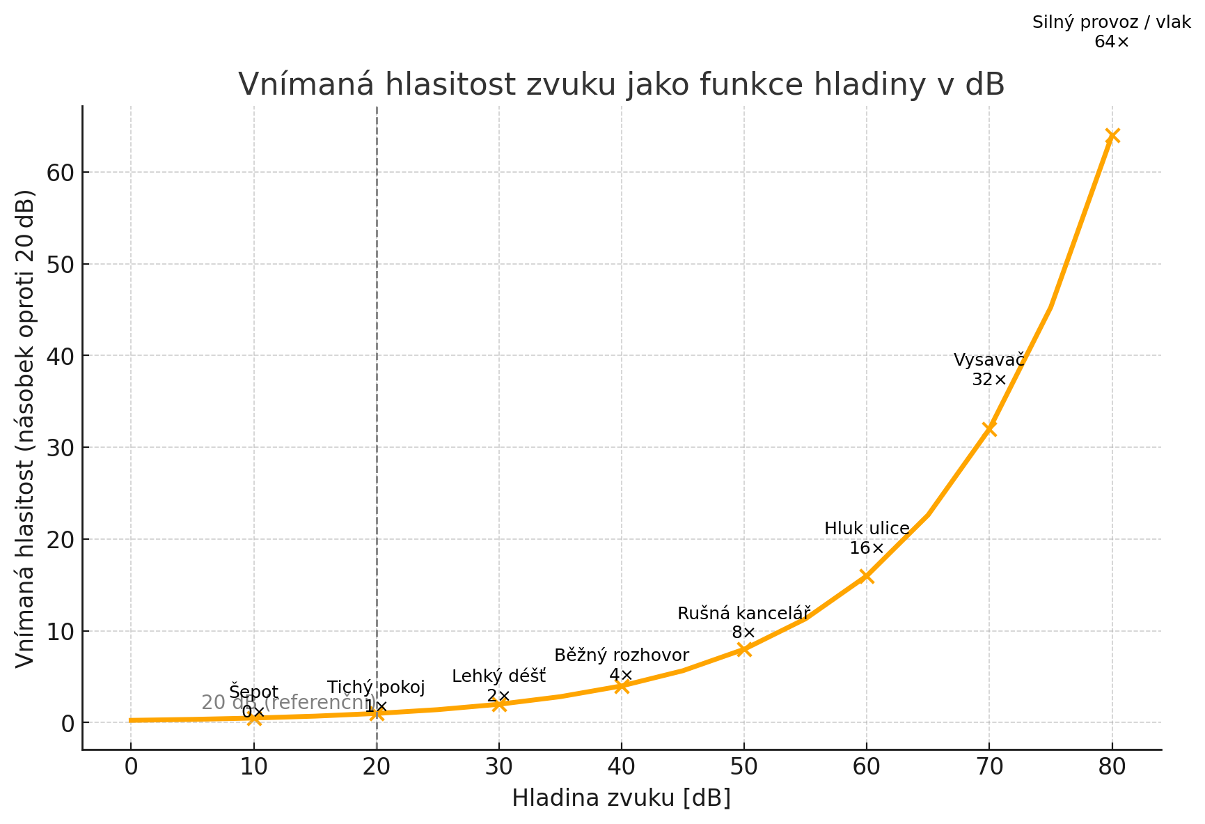 Pro ilustraci je zde graf toho, jak ucho vnímá rozdíl hlasitosti v závislosti na hladině intenzity zvuku v dB.